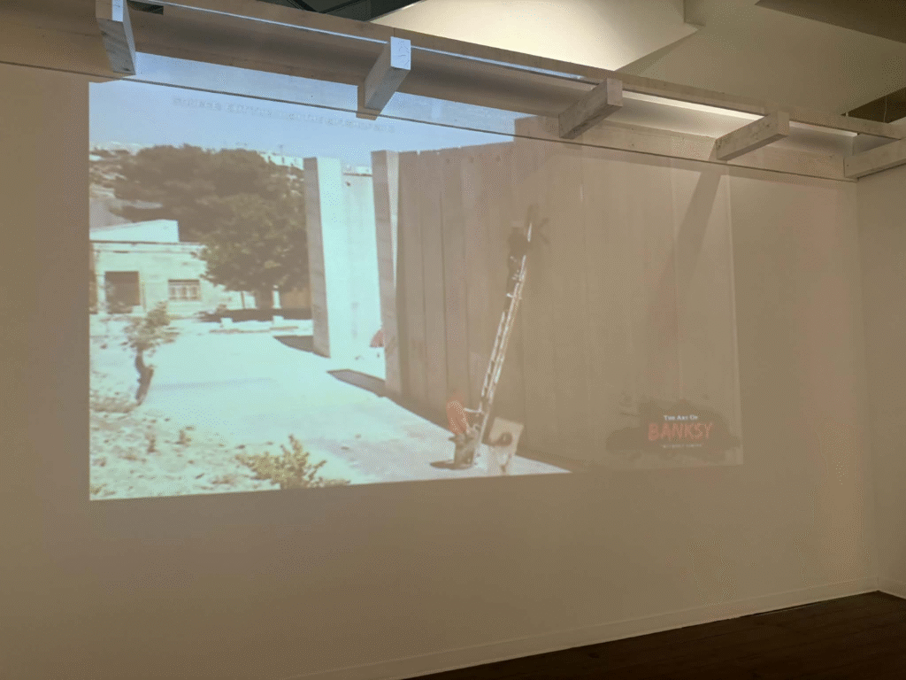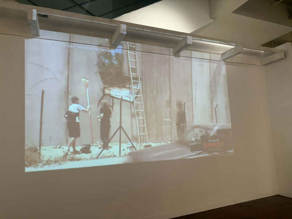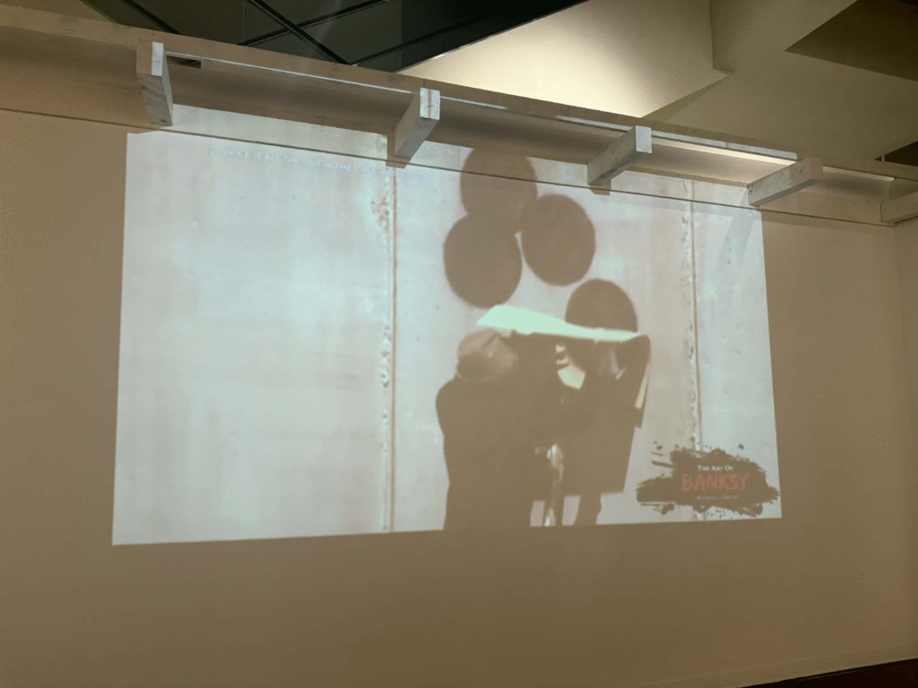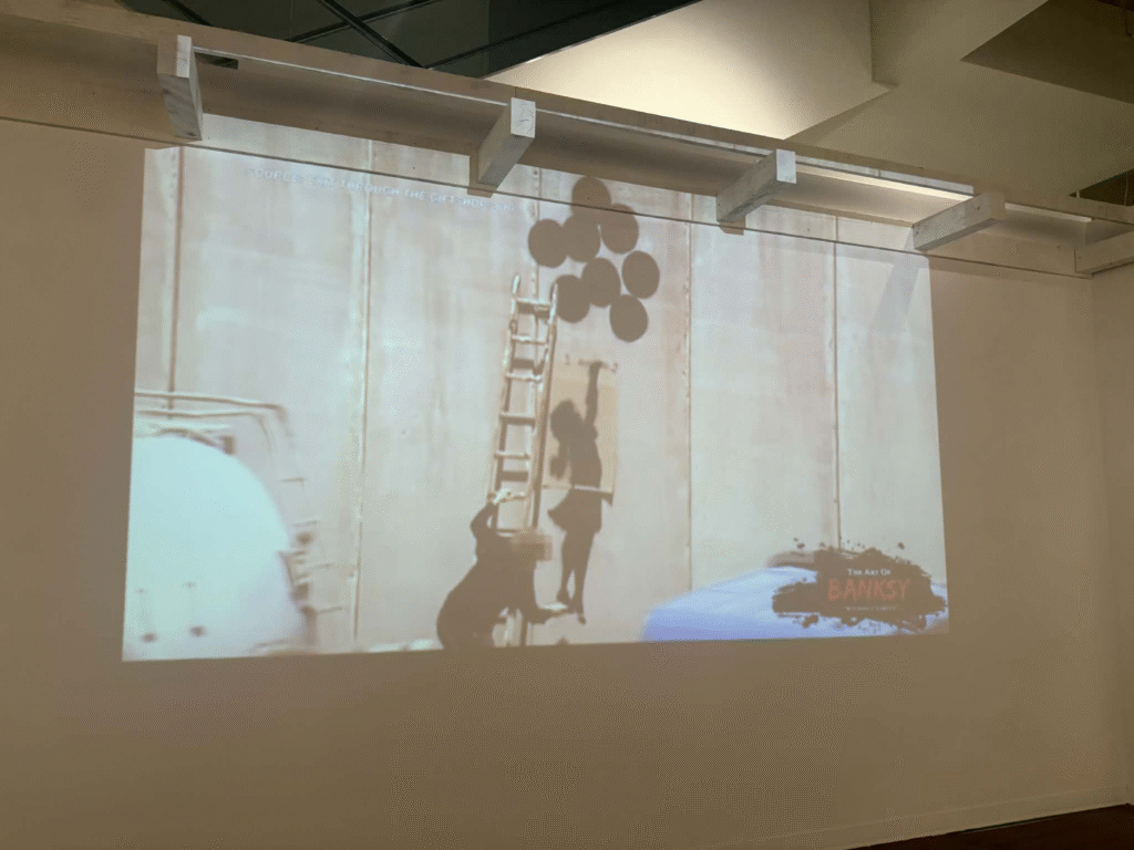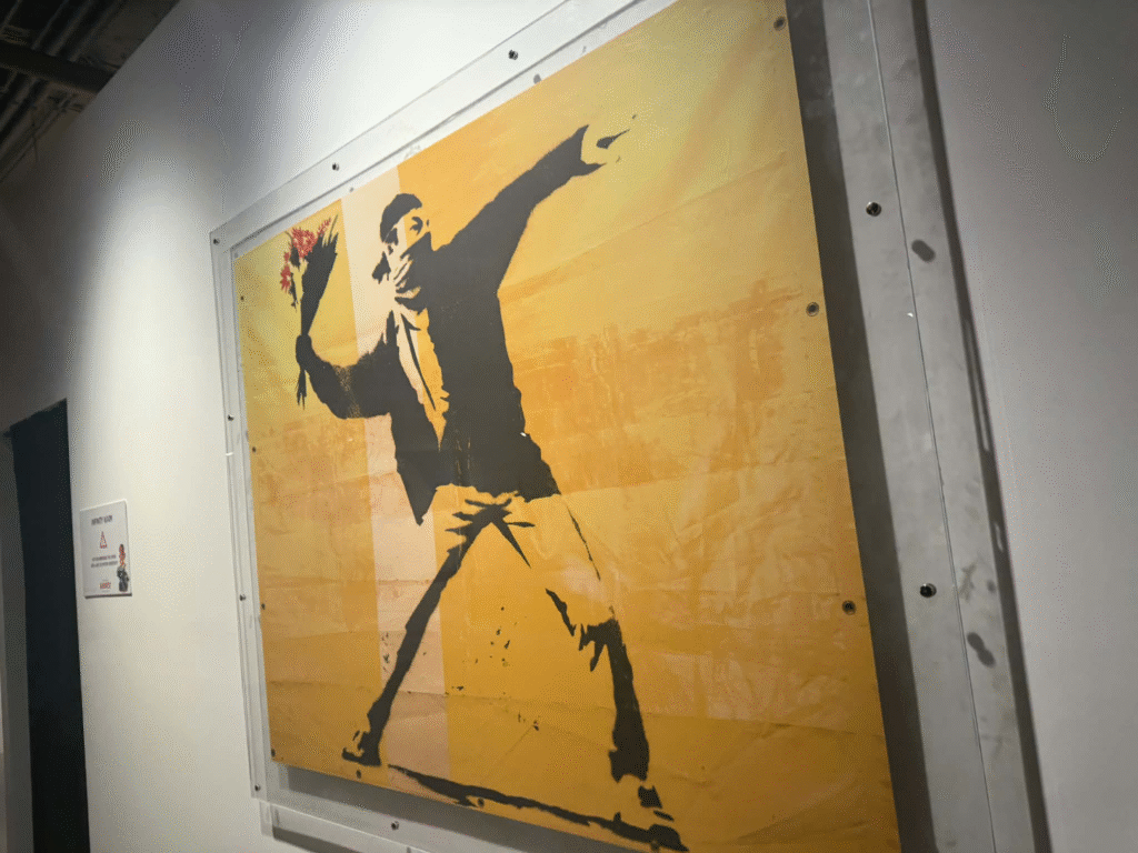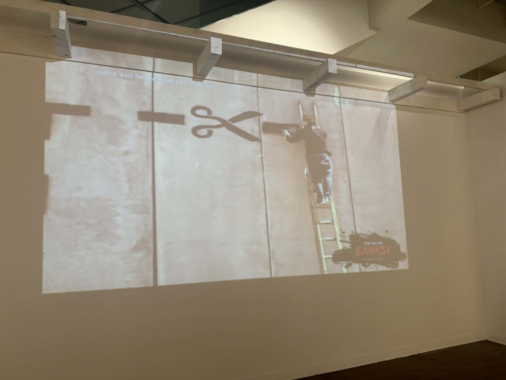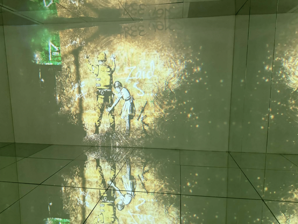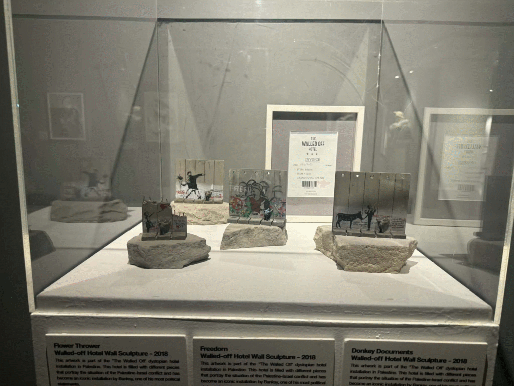 من أبرز ما يلفت الانتباه في المعرض هو وجود زاوية خاصة تركز على فلسطين. لقد خصص المنظمون مساحة لعرض أعمال بانسكي التي تناولت القضية الفلسطينية وموضوعات الاحتلال والعدالة الاجتماعية، وهو جانب مهم من أعماله السياسية . هذه الزاوية أعطت الزوار فرصة للتأمل في البعد الإنساني والسياسي للفنان، وأظهرت كيف يستخدم بانسكي فن الشارع كأداة للفت الانتباه إلى قضايا عالمية ملحة.