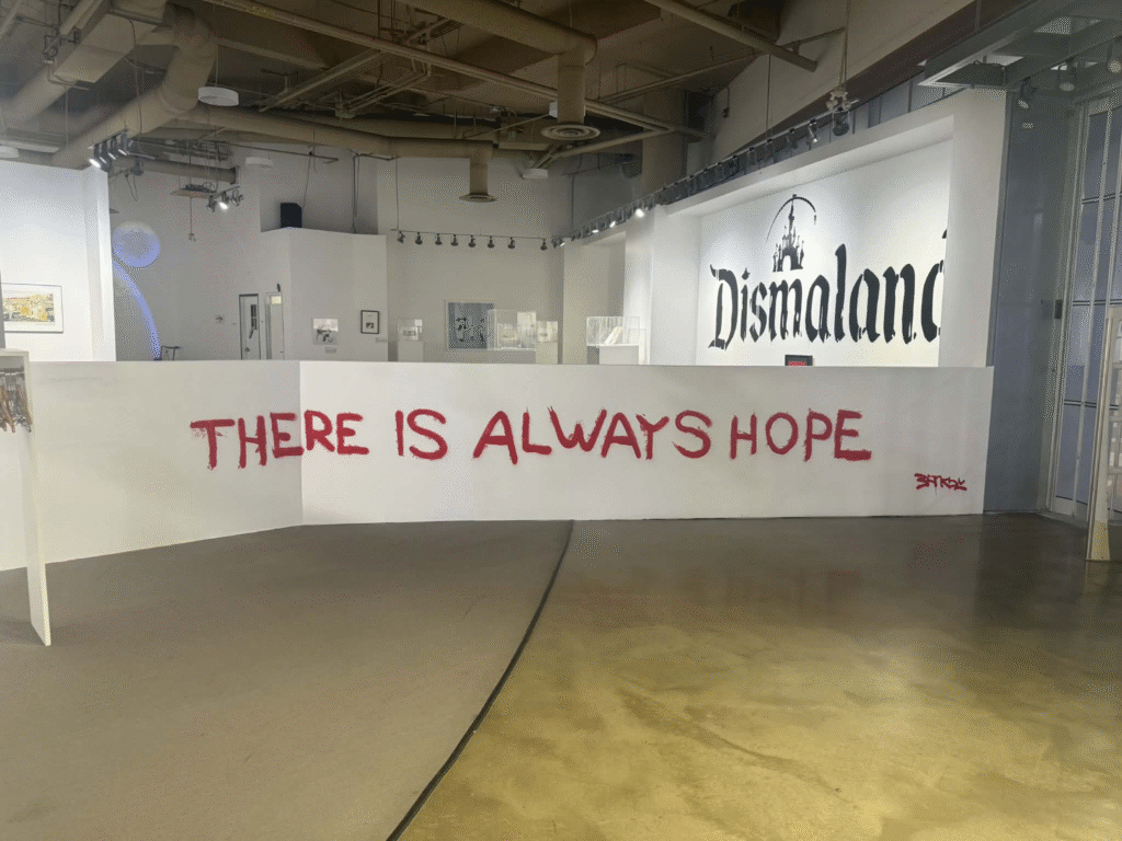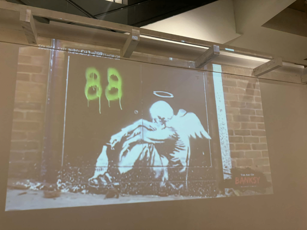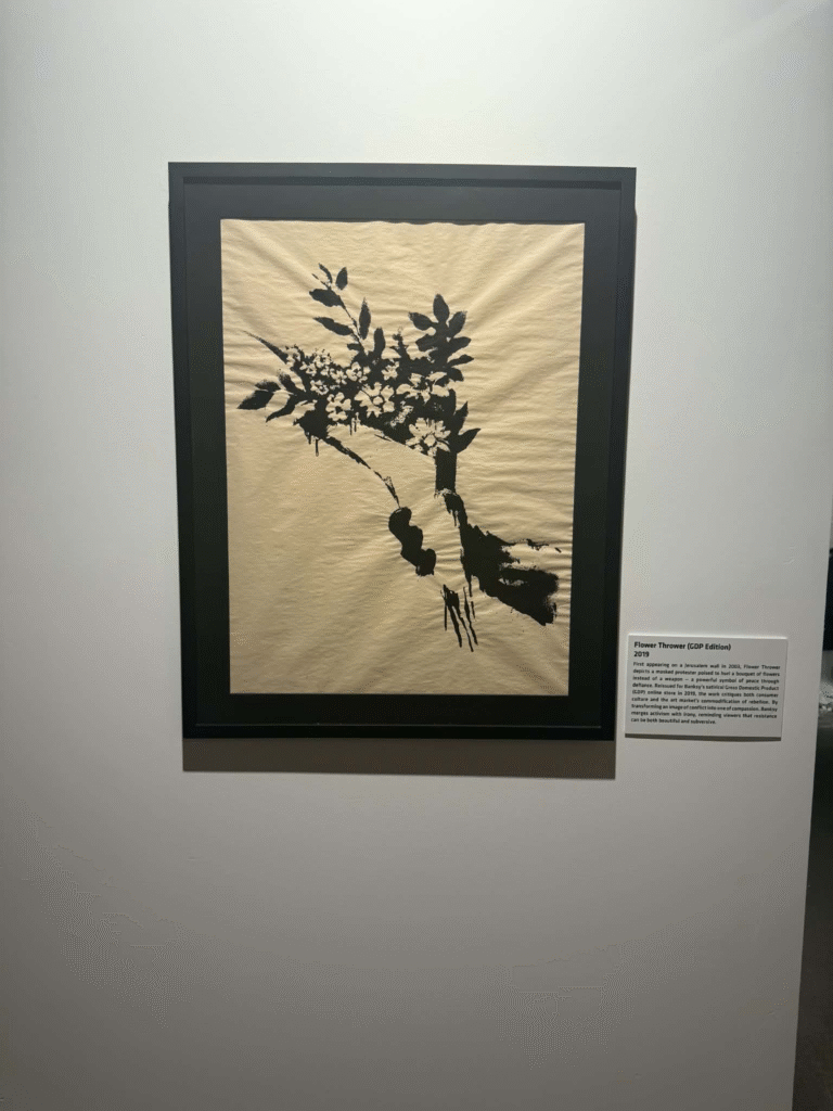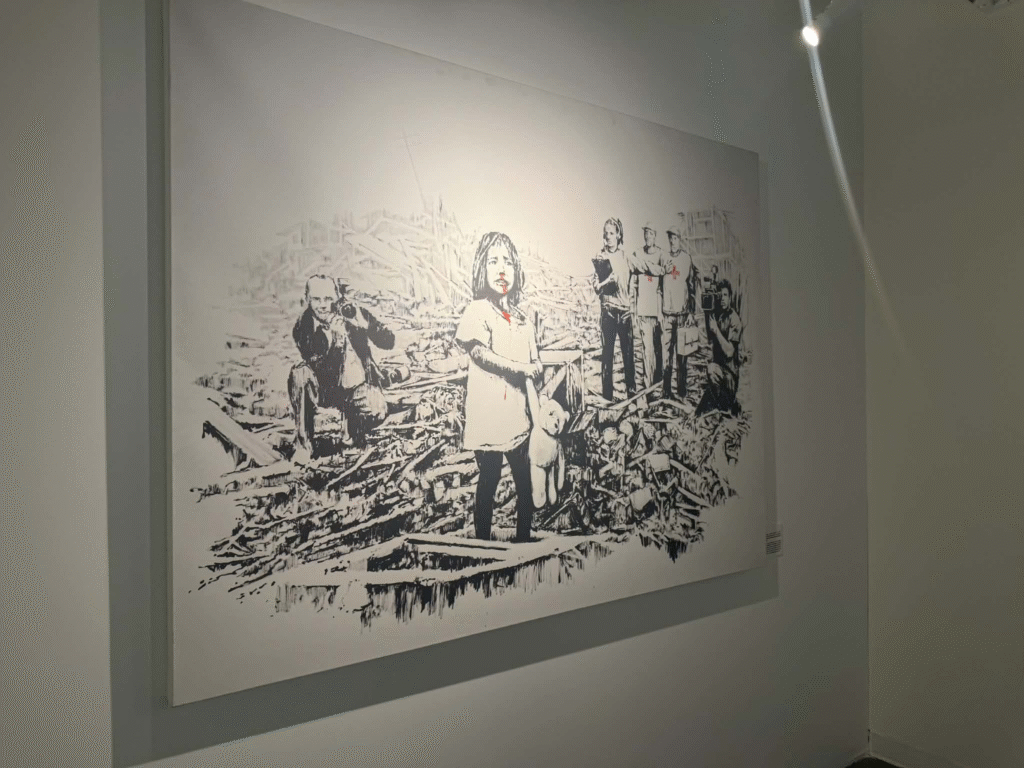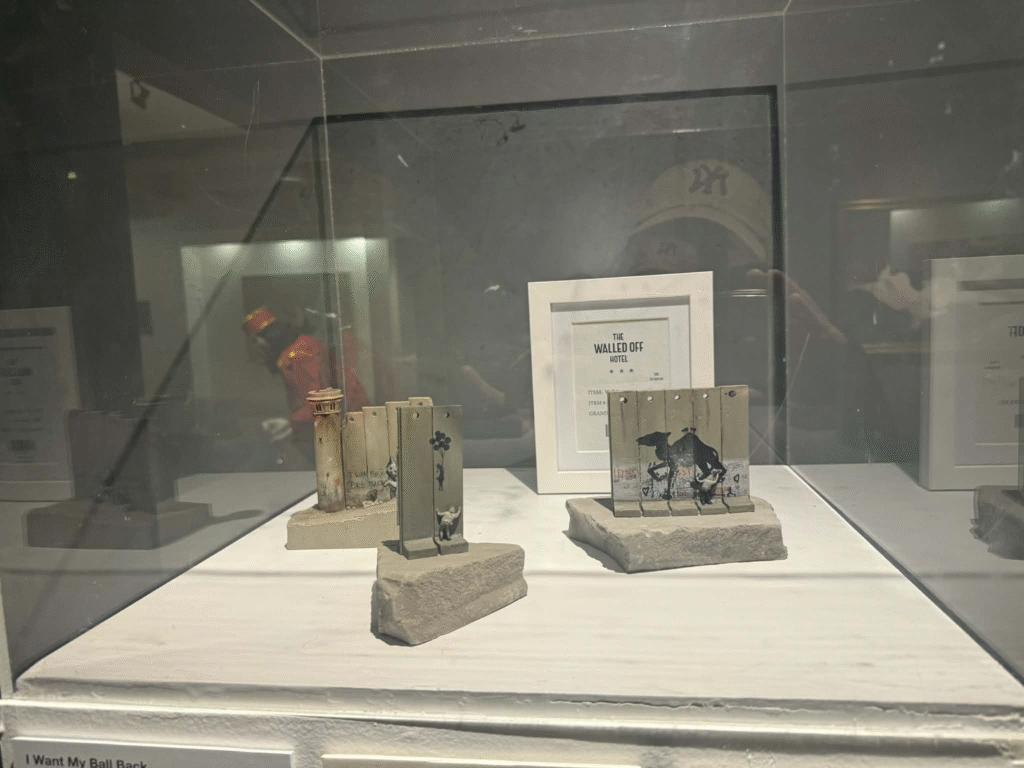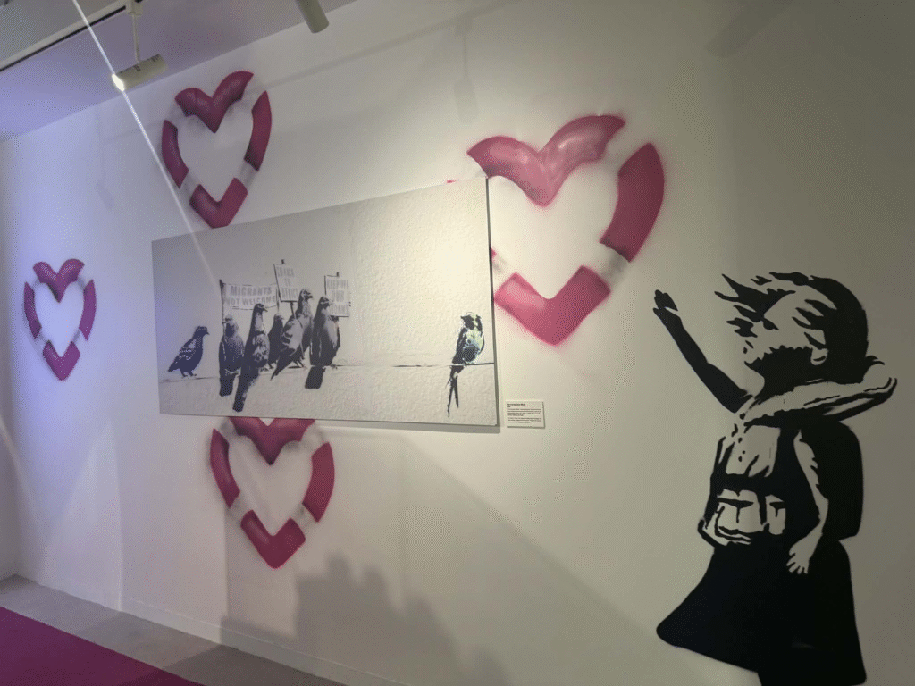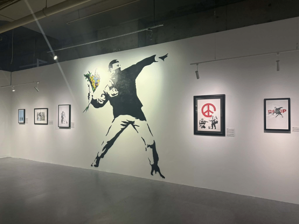 من أبرز ما يلفت الانتباه في المعرض هو وجود زاوية خاصة تركز على فلسطين. لقد خصص المنظمون مساحة لعرض أعمال بانسكي التي تناولت القضية الفلسطينية وموضوعات الاحتلال والعدالة الاجتماعية، وهو جانب مهم من أعماله السياسية . هذه الزاوية أعطت الزوار فرصة للتأمل في البعد الإنساني والسياسي للفنان، وأظهرت كيف يستخدم بانسكي فن الشارع كأداة للفت الانتباه إلى قضايا عالمية ملحة.