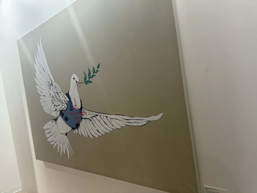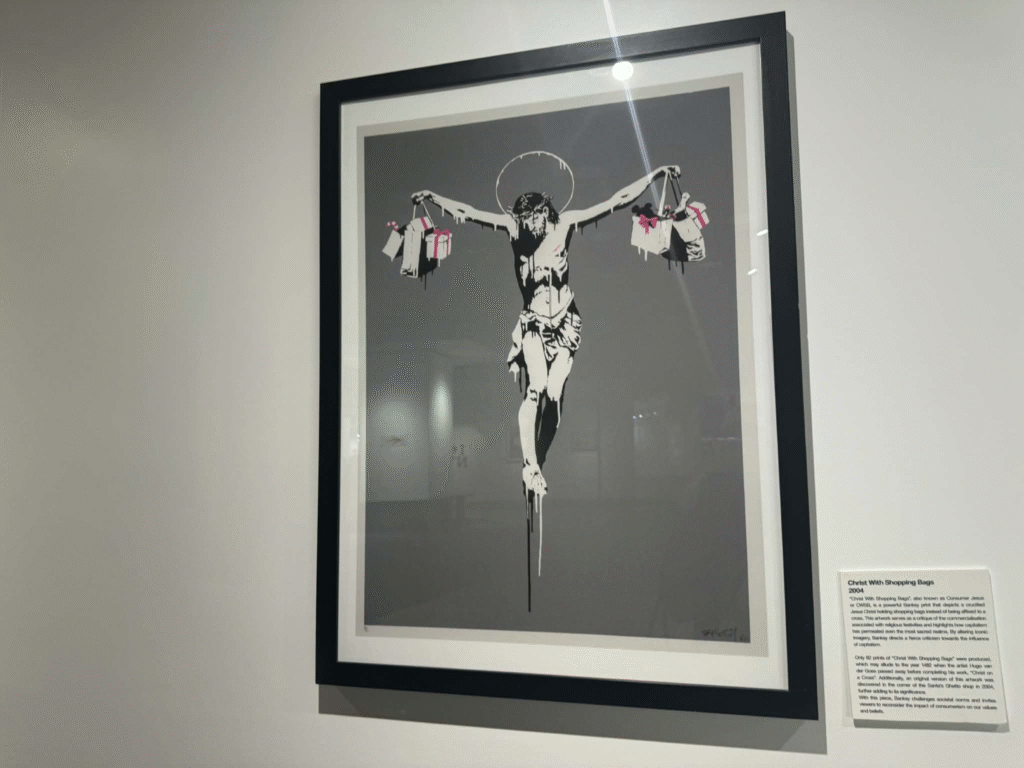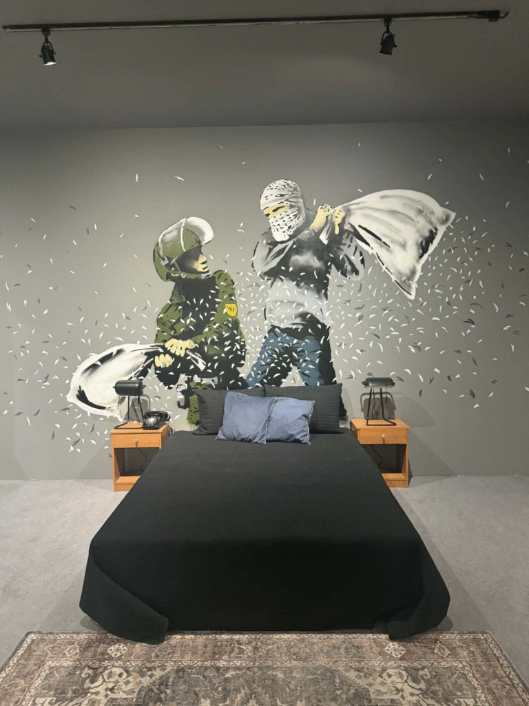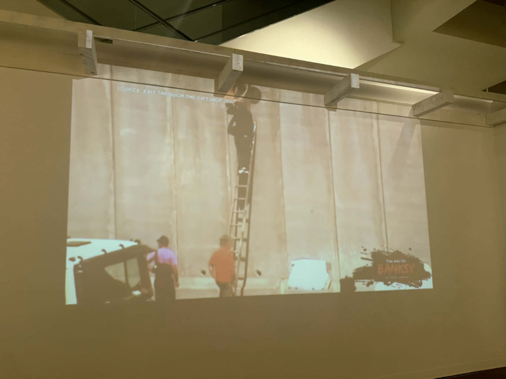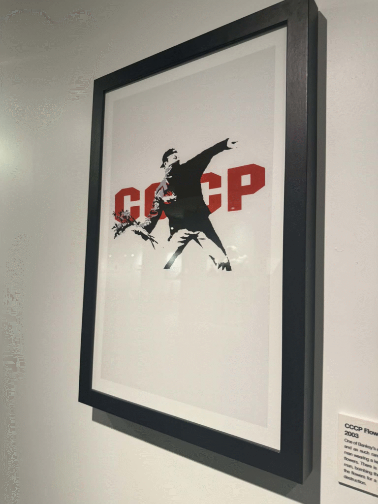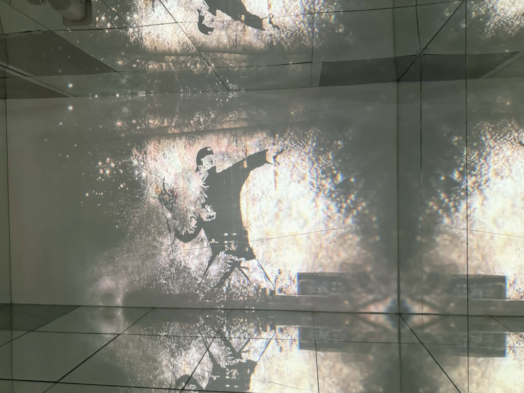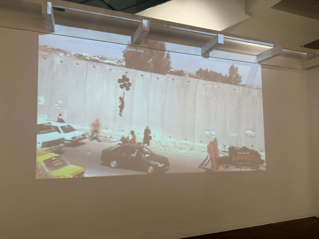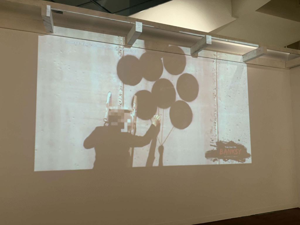 من أبرز ما يلفت الانتباه في المعرض هو وجود زاوية خاصة تركز على فلسطين. لقد خصص المنظمون مساحة لعرض أعمال بانسكي التي تناولت القضية الفلسطينية وموضوعات الاحتلال والعدالة الاجتماعية، وهو جانب مهم من أعماله السياسية . هذه الزاوية أعطت الزوار فرصة للتأمل في البعد الإنساني والسياسي للفنان، وأظهرت كيف يستخدم بانسكي فن الشارع كأداة للفت الانتباه إلى قضايا عالمية ملحة.