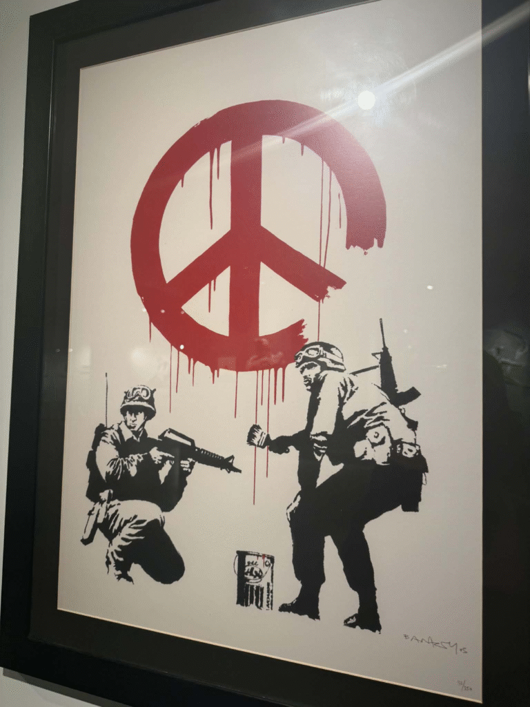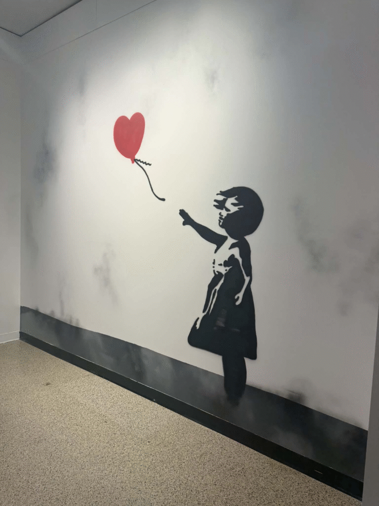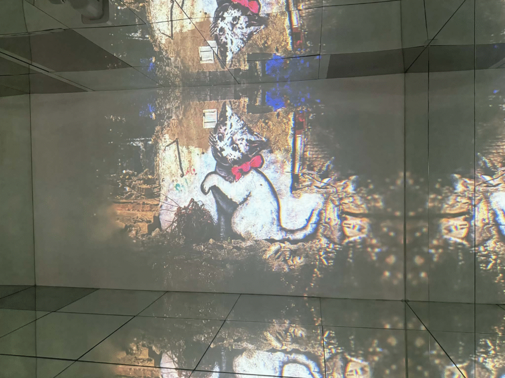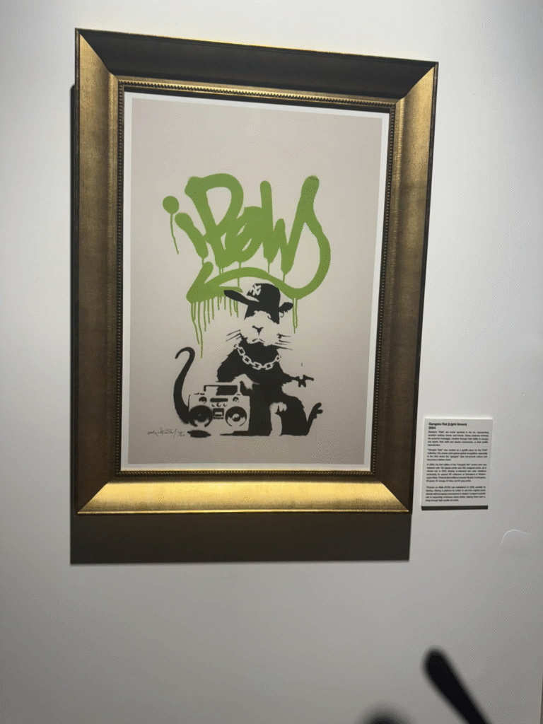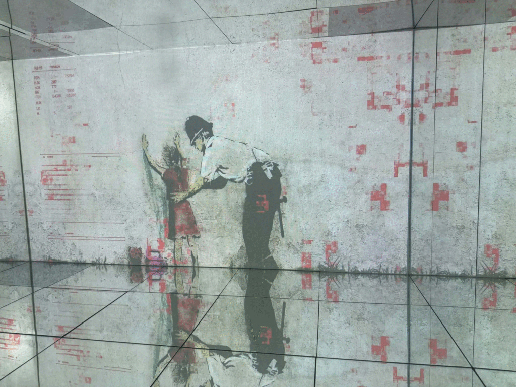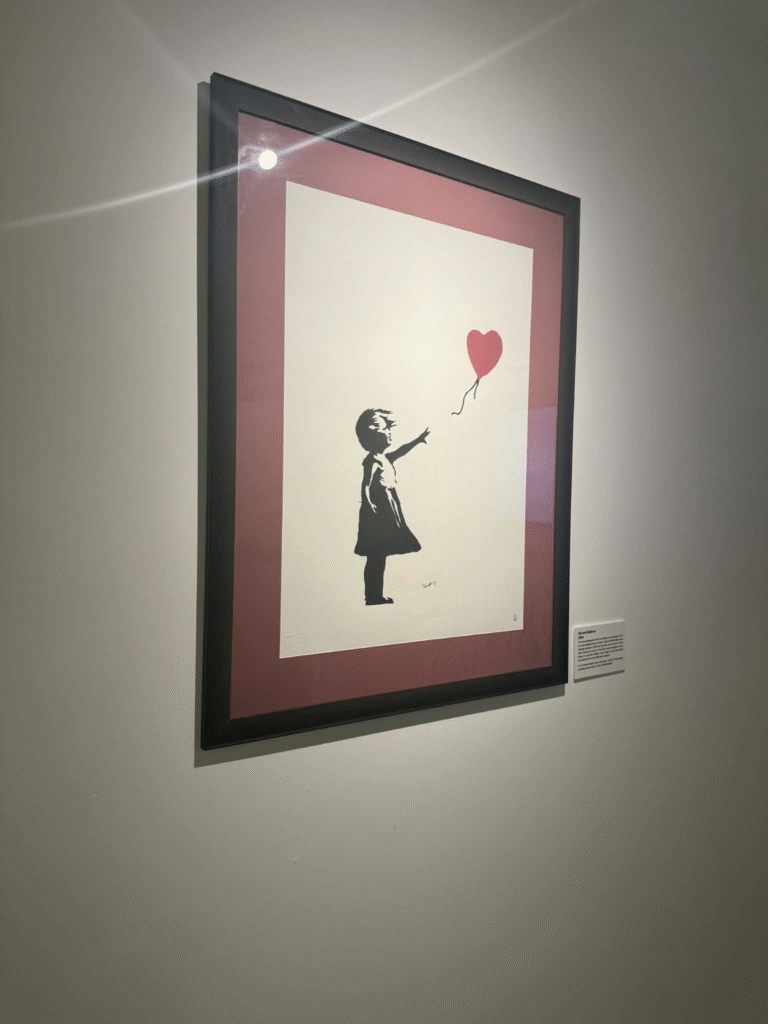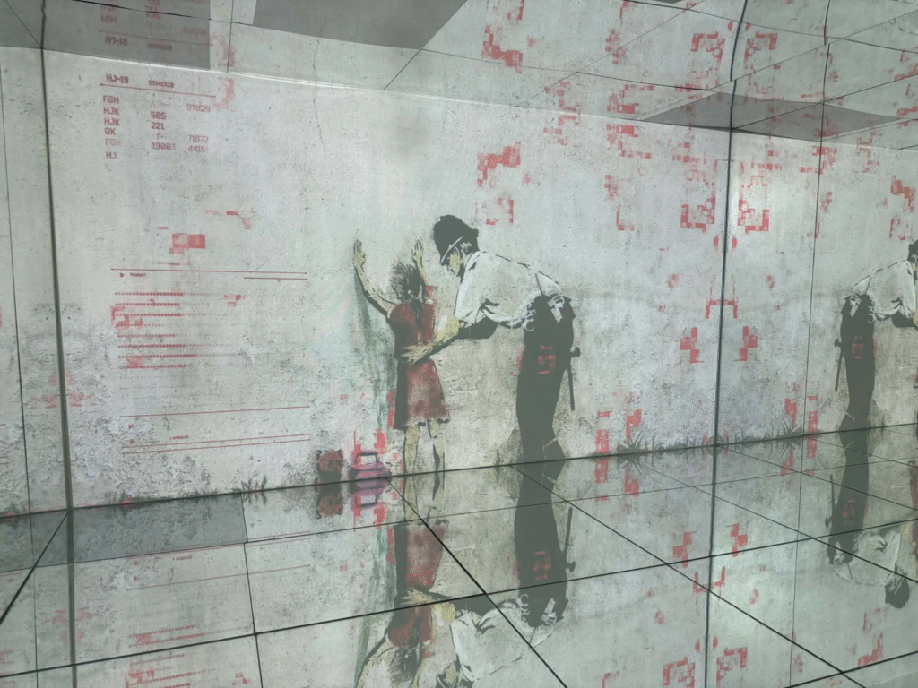 من أبرز ما يلفت الانتباه في المعرض هو وجود زاوية خاصة تركز على فلسطين. لقد خصص المنظمون مساحة لعرض أعمال بانسكي التي تناولت القضية الفلسطينية وموضوعات الاحتلال والعدالة الاجتماعية، وهو جانب مهم من أعماله السياسية . هذه الزاوية أعطت الزوار فرصة للتأمل في البعد الإنساني والسياسي للفنان، وأظهرت كيف يستخدم بانسكي فن الشارع كأداة للفت الانتباه إلى قضايا عالمية ملحة.