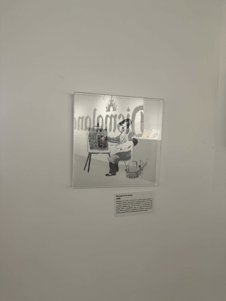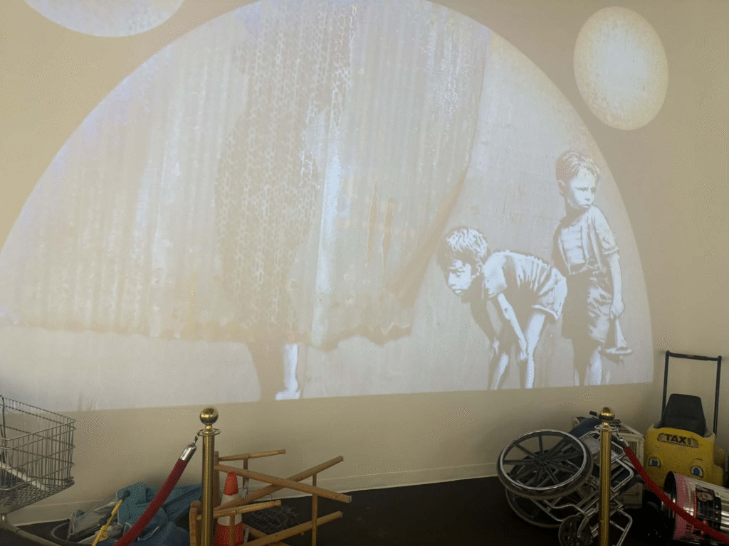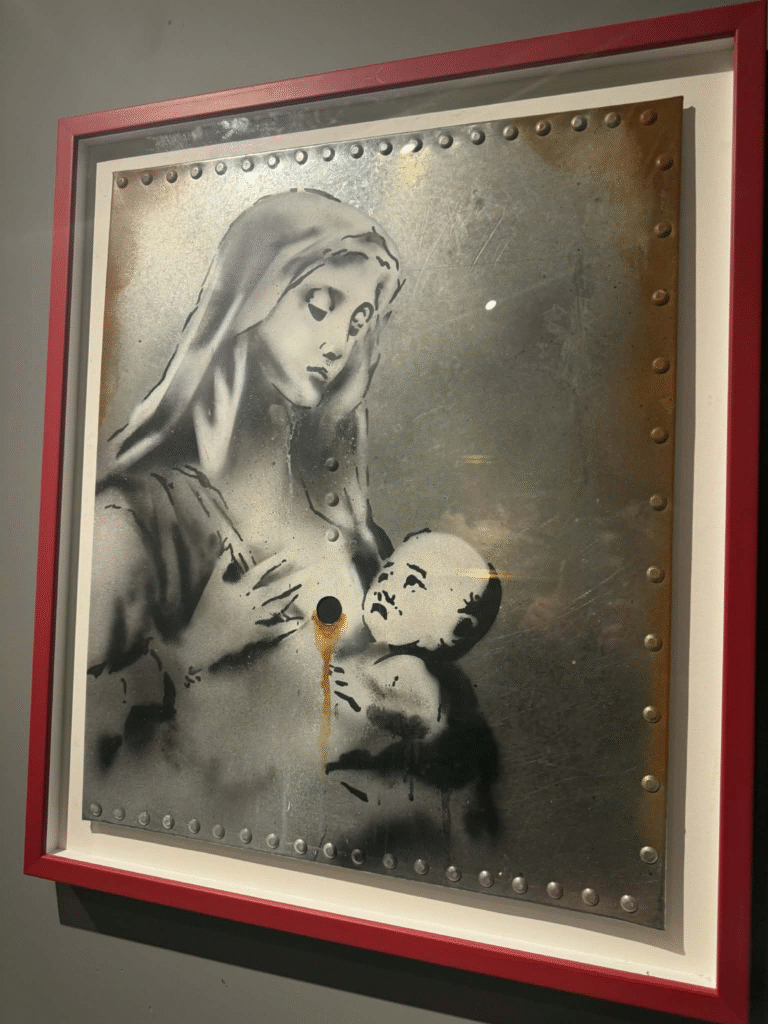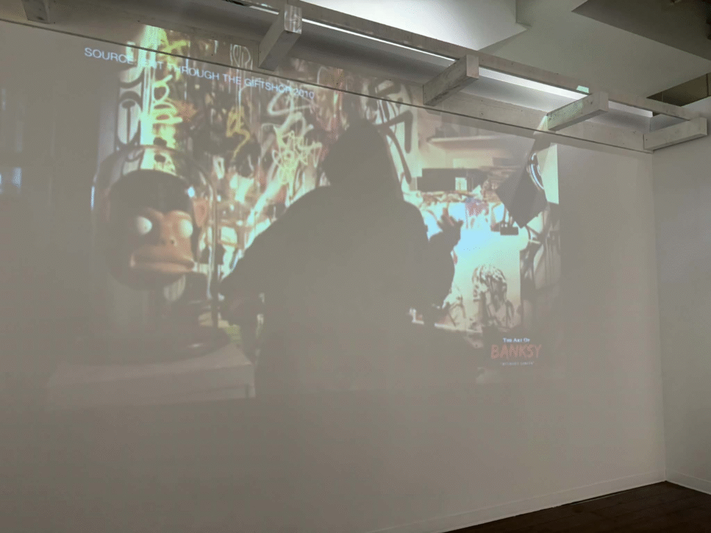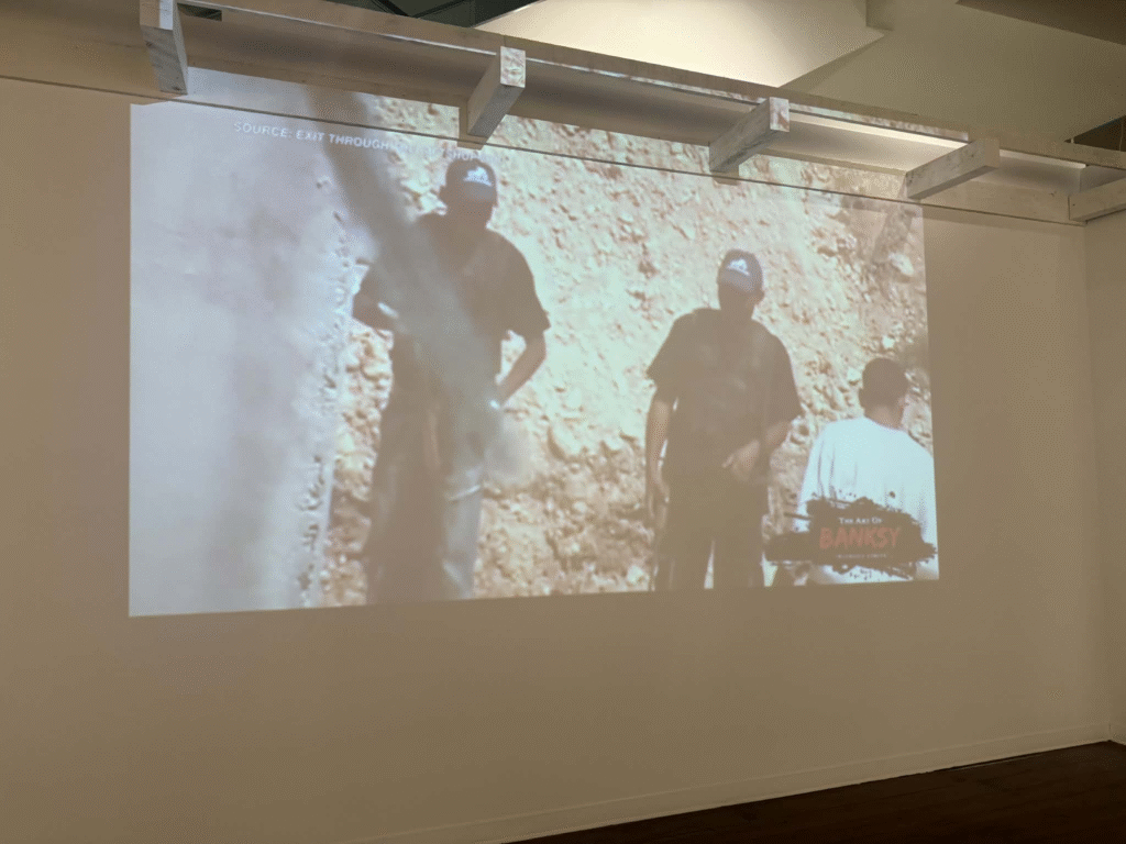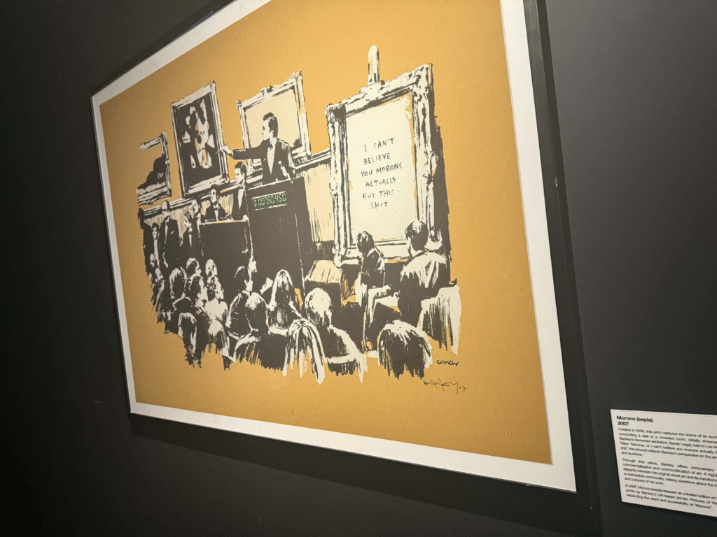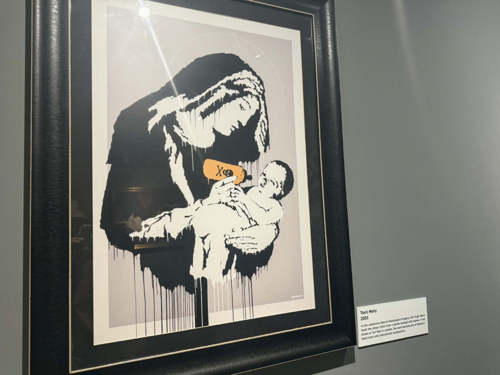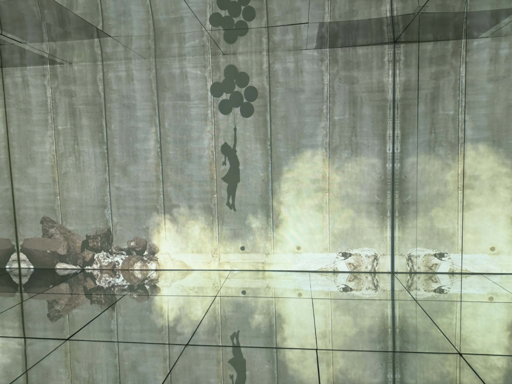 من أبرز ما يلفت الانتباه في المعرض هو وجود زاوية خاصة تركز على فلسطين. لقد خصص المنظمون مساحة لعرض أعمال بانسكي التي تناولت القضية الفلسطينية وموضوعات الاحتلال والعدالة الاجتماعية، وهو جانب مهم من أعماله السياسية . هذه الزاوية أعطت الزوار فرصة للتأمل في البعد الإنساني والسياسي للفنان، وأظهرت كيف يستخدم بانسكي فن الشارع كأداة للفت الانتباه إلى قضايا عالمية ملحة.